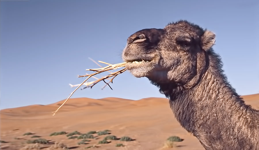 Camels are superbly adapted to obtaining adequate nutrition from desert shrubs and herbs that they consume when available. Their lips are thick and the upper lip is divided and very sensitive. It is well suited to pick small leaves from branches. Camels can devour even thorny dry branches without discomfort.